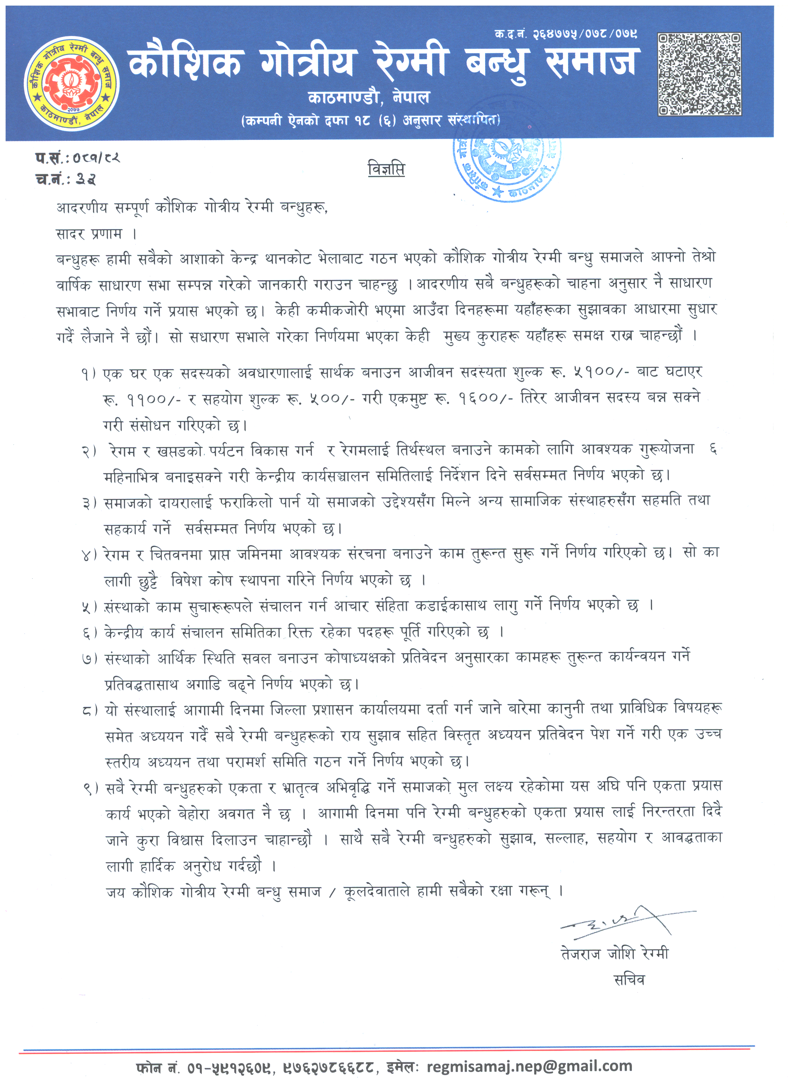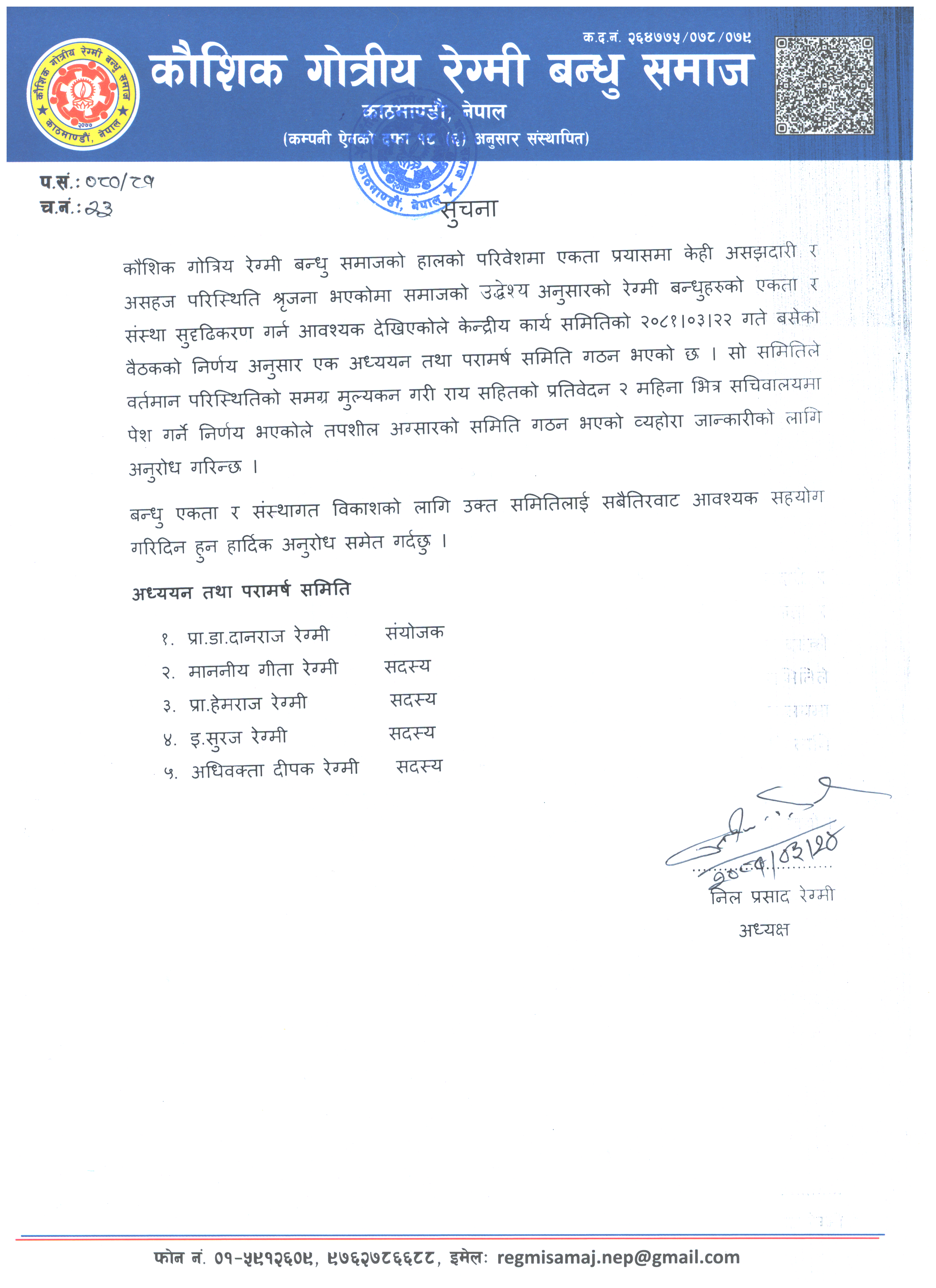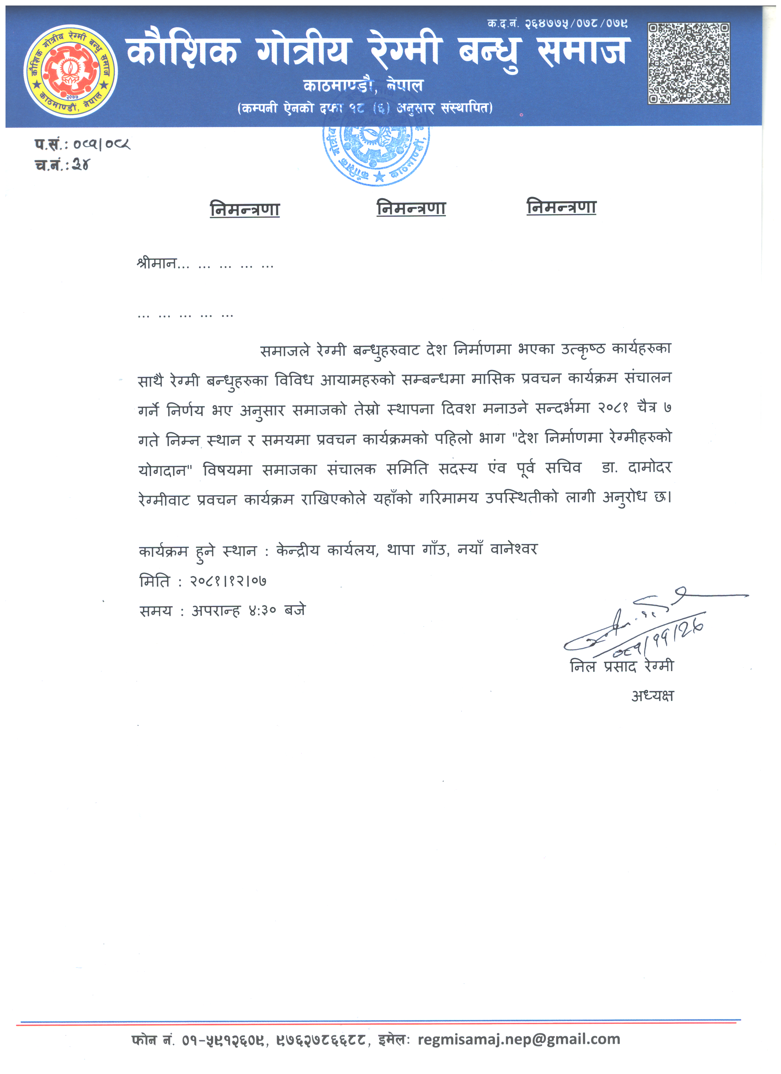 आस्थावान रेग्मीबन्धुहरुका सल्लाह र चाहना अनुसार समाजका गतिबिधीहरु एबं महत्वपूर्ण सूचनाहरु