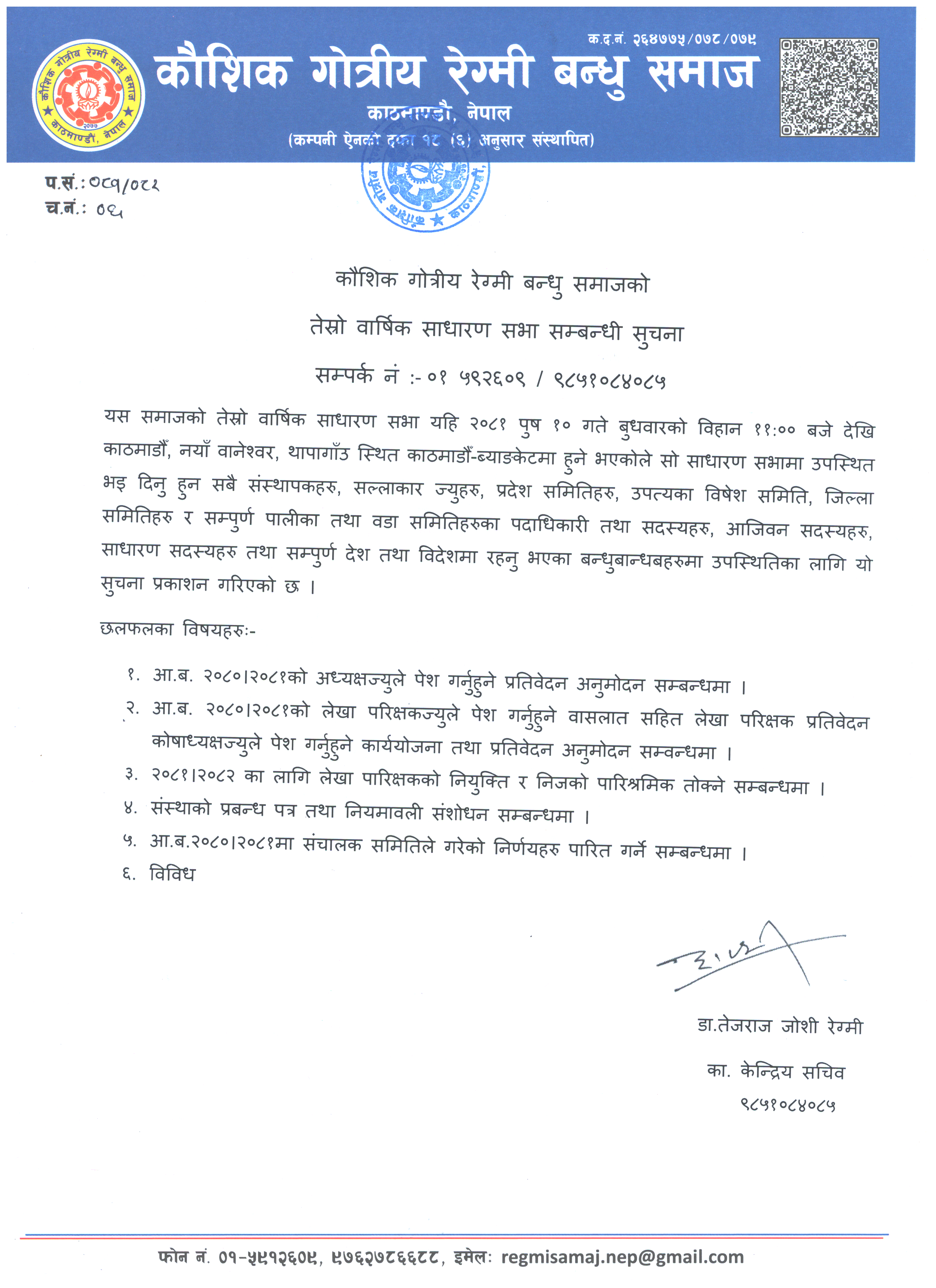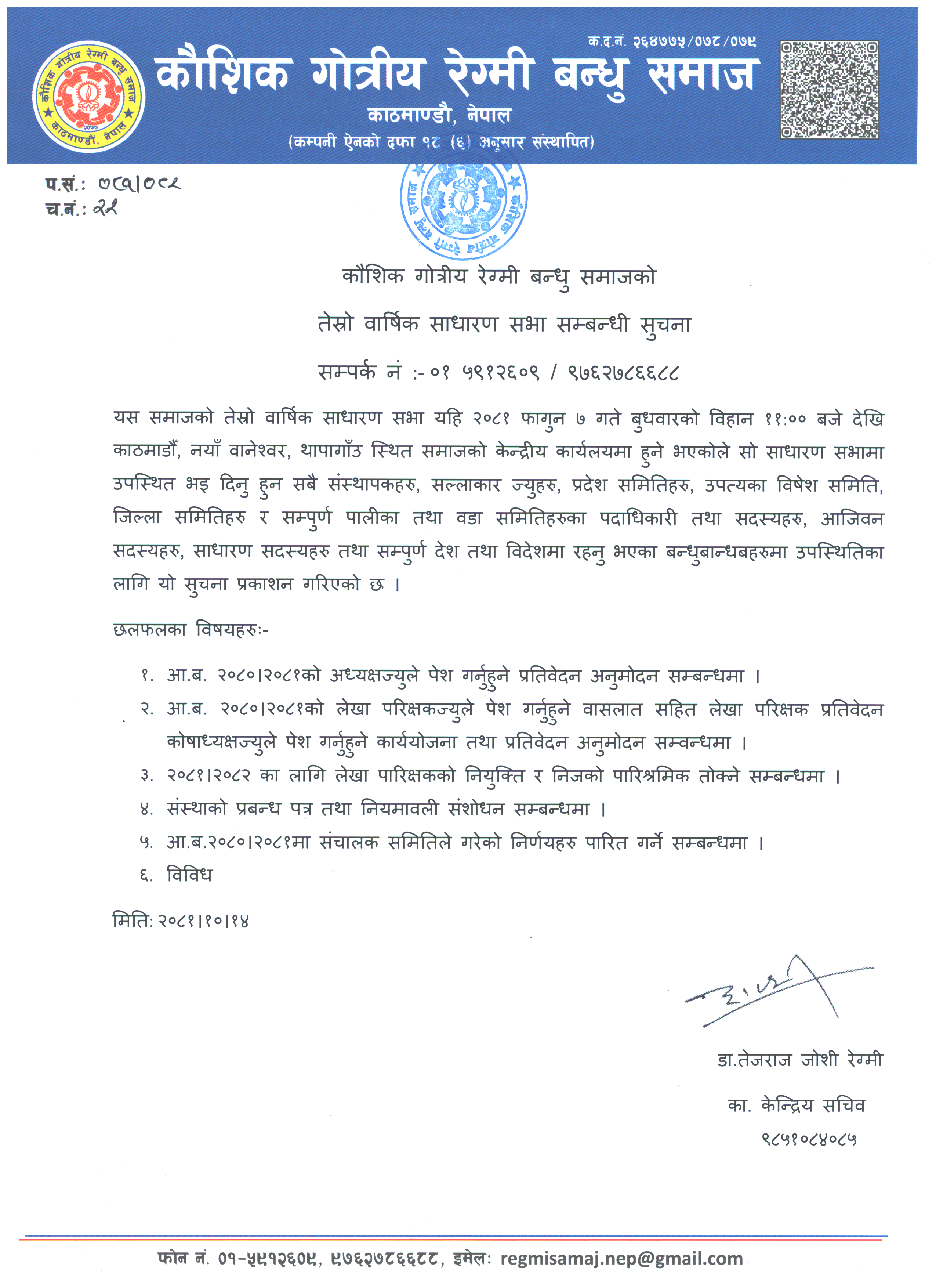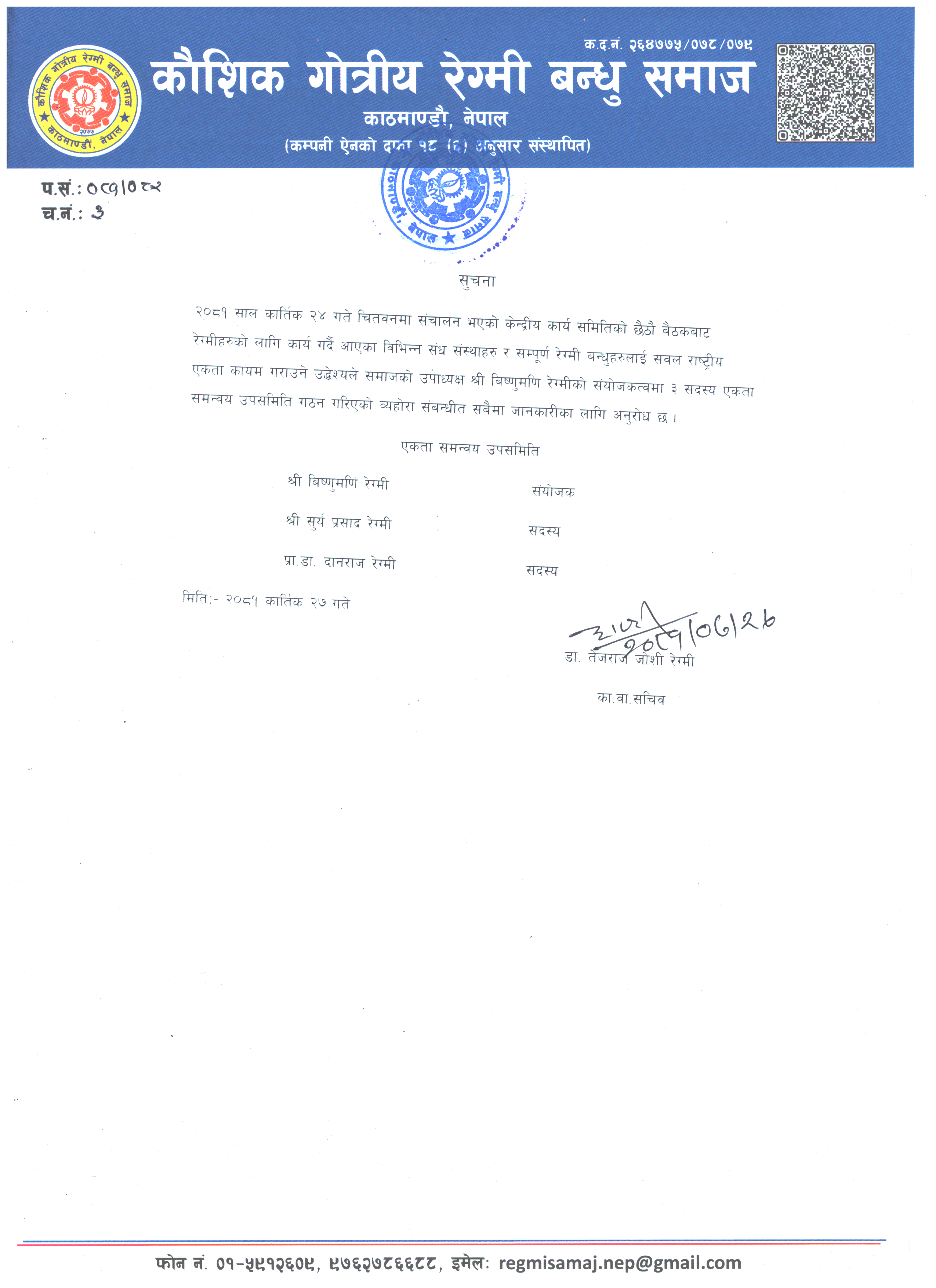 आस्थावान रेग्मीबन्धुहरुका सल्लाह र चाहना अनुसार समाजका गतिबिधीहरु एबं महत्वपूर्ण सूचनाहरु